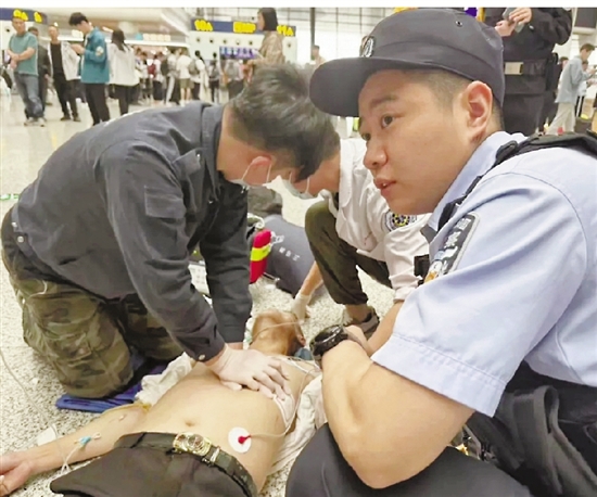 “快点拨打120急救电话,通知客运需要AED除颤仪,会急救的旅客跟我一起做心肺复苏!”当时,正在巡逻的民警郭哲炜闻讯赶来。此时,该旅客已心脏骤停,呼吸也没了!千钧一发之际,在郭哲炜的指挥下,众人接力,争分夺秒开展心肺复苏和除颤。终于,在大家的努力下,旅客恢复了心跳和呼吸。8分钟后,120急救人员抵达现场,通过现场急救,该旅客恢复了基本的生命体征。此时已满头大汗的郭哲炜协助医护人员将该旅客抬上担架送往医院。“多亏了日常的急救培训,真的尽力了,这是和死神赛跑。”事后,郭哲炜这样说。