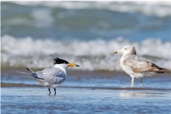 | 近日,中华凤头燕鸥在福建闽江河口湿地现身。据介绍,中华凤头燕鸥又名黑嘴端凤头燕鸥,为国家一级保护动物,因踪迹罕见数量稀少,被称为“神话之鸟”。作为东亚—澳大利西亚候鸟迁飞通道的重要驿站,闽江河口湿地是中国单位面积水鸟种类和数量分布最多的区域之一,吸引了中华凤头燕鸥、勺嘴鹬、黑脸琵鹭等珍稀濒危鸟类栖息觅食。 图为5月14日,一只中华凤头燕鸥(左)和一只黑尾鸥在闽江河口湿地海滩觅食。 新华社 魏培全 摄 |