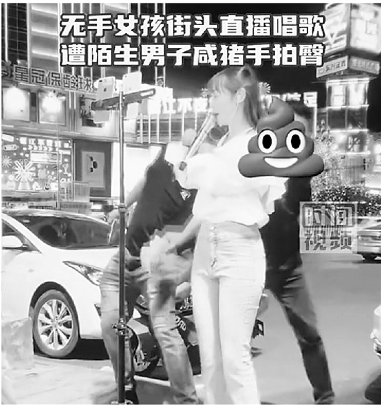 5月15日,福建晋江。一名无手女孩在时代Soho西北门街头直播唱歌时,被一路过男子猥亵拍臀。5月16日,青阳派出所称,已接到报警,正在处理。