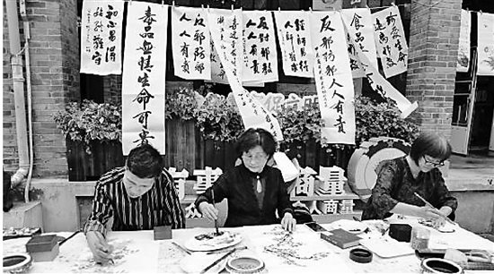 在平安市集的反邪教书画文创长廊前,聚集着很多市民,原来,满天星托育中心的小朋友们正在白色布包上创作着反邪教图画。小朋友们以天马行空的想象力,画出他们心中的反邪教图景,引得边上围观的大人们啧啧点赞。之后,这些布包将通过一场场反邪教宣传活动,传递到更多人手中。另一边,书画院的老师们挥毫泼墨,创作着反邪教平安标语,并将书法作品现场送给群众。