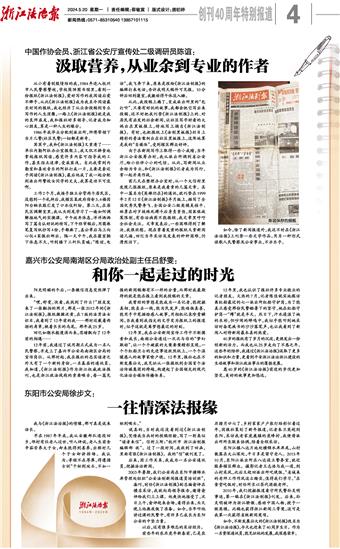 从小有着制服情结的我,1984年进入杭州市人民警察警校,学校简陋图书馆里,看到一份报纸《浙江法制报》,爱好写作的我阅读后爱不释手,从此《浙江法制报》成为我至今阅读最长时间的报纸,我也经历了从业余投稿到专业写作的人生涅槃,一路上《浙江法制报》就是我的良师益友,我和报社好多领导、记者成为知心朋友,算是一种人生的缘分。