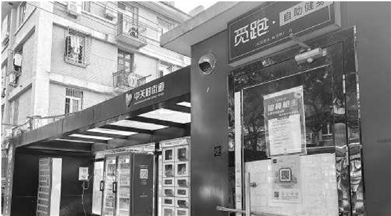 记者在现场看到,智慧便民服务亭由几部分组成——一台智能书吧设备、一台全封闭自助健身舱,以及两组自动售卖柜。不过,目前只有两组自动售卖柜可用。智慧便民服务亭的左侧,一米多高的“小宝玩书吧”自动设备柜,数十个小方格中,玩具和书籍都已落了灰,柜体右中部分的显示屏完全“黑脸”。柜子下方,一条已经断掉裸露的电线,弯曲着随意“躺”在水泥地上。而右侧的自助健身舱,不仅无法正常打开,连玻璃门都被一根钢条加固封锁。玻璃门上的二维码,扫码无法正常跳转。透过玻璃门望去,健身舱内部摆放着跑步机、空调、电暖器等设备,但显然不能正常工作了。