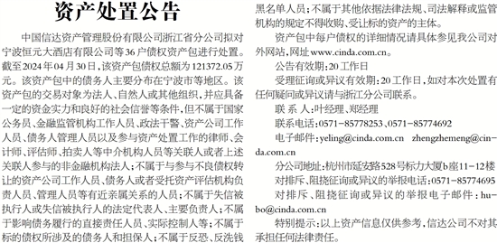 中国信达资产管理股份有限公司浙江省分公司拟对宁波恒元大酒店有限公司等36户债权资产包进行处置。截至2024年04月30日,该资产包债权总额为121372.05万元。该资产包中的债务人主要分布在宁波市等地区。该资产包的交易对象为法人、自然人或其他组织,并应具备一定的资金实力和良好的社会信誉等条件,但不属于国家公务员、金融监管机构工作人员、政法干警、资产公司工作人员、债务人管理人员以及参与资产处置工作的律师、会计师、评估师、拍卖人等中介机构人员等关联人或者上述关联人参与的非金融机构法人;不属于与参与不良债权转让的资产公司工作人员、债务人或者受托资产评估机构负责人员、管理人员等有近亲属关系的人员;不属于失信被执行人或失信被执行人的法定代表人、主要负责人;不属于影响债务履行的直接责任人员、实际控制人等;不属于标的债权所涉及的债务人和担保人;不属于反恐、反洗钱黑名单人员;不属于其他依据法律法规、司法解释或监管机构的规定不得收购、受让标的资产的主体。