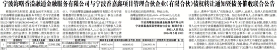 根据法律及财政部、银监会的有关规定,以及宁波海曙香溢融通金融服务有限公司与宁波香嘉鑫项目管理合伙企业(有限合伙)签署的《债权转让协议》(编号XYJFZR202404253),宁波海曙香溢融通金融服务有限公司已将其对下列借款人及其担保人项下享有的全部权利(包括但不限于主债权、担保债权、违约金债权、利息债权、损失赔偿权)依法转让给宁波香嘉鑫项目管理合伙企业(有限合伙)。宁波海曙香溢融通金融服务有限公司与宁波香嘉鑫项目管理合伙企业(有限合伙)联合公告通知各借款人及担保人以及其他相关各方。
