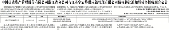 中国信达资产管理股份有限公司浙江省分公司与江苏宇宏烨供应链管理有限公司债权转让通知暨债务催收联合公告