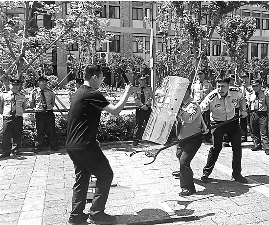 近日,台州市公安局椒江分局巡特警大队民警联合治安大队、葭沚派出所民警来到台州学院,对校园保安员开展培训,示范讲解盾牌等装备的使用方法,提升保安员应对突发事件的能力。