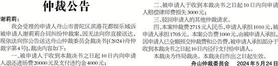 我会受理的申请人舟山市普陀区滨港花都娱乐城诉被申请人谢莉莉合同纠纷仲裁案,因无法向你直接送达,现依法向你公告送达舟山仲裁委员会裁决书[(2024)舟仲裁字第4号],裁决内容如下: