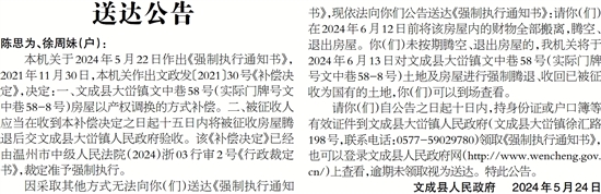 因采取其他方式无法向你(们)送达《强制执行通知书》,现依法向你们公告送达《强制执行通知书》:请你(们)在2024年6月12日前将该房屋内的财物全部搬离,腾空、退出房屋。你(们)未按期腾空、退出房屋的,我机关将于2024年6月13日对文成县大峃镇文中巷58号(实际门牌号文中巷58-8号)土地及房屋进行强制腾退、收回已被征收为国有的土地,你(们)可以到场查看。