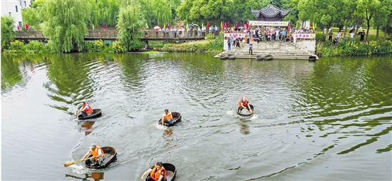 5月25日,湖州市吴兴区东林镇举办“庆端午 划菱桶”水乡端午趣味民俗活动。菱桶是河网密布的东林镇百姓家中常见的一种传统水上劳动工具,村民在捕鱼、采菱、采荷时都要用到。