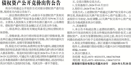 一、拟出售的债权资产:由部分不良债权资产及相关权益组成。债权资产初定本金余额人民币7279.96万元左右。主债务人及担保人主要分布在浙江嘉兴市、山东潍坊市。债权资产最终项目及金额以正式交易文件为准。