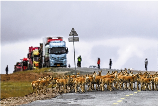 | 记者从三江源国家公园管理局长江源园区可可西里管理处了解到,当前,可可西里藏羚羊已经进入迁徙高峰期,管理部门提醒往来游客、车辆听从工作人员现场指挥,严禁擅自进入保护区,并注意避让迁徙动物。 据可可西里管理处统计,目前已有超过2500只雌性藏羚羊通过青藏公路五道梁地区。 新华社 张龙 摄 |