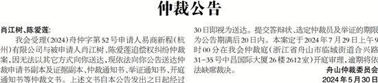 我会受理(2024)舟仲字第52号申请人易商新程(杭州)有限公司与被申请人肖江树、陈爱莲追偿权纠纷仲裁案,因无法以其它方式向你送达,现依法向你公告送达仲裁申请书副本及证据副本、仲裁通知书、举证通知书、开庭通知书等仲裁文书。上述文书自本公告发出之日起经过30日即视为送达。提交答辩状、选定仲裁员及举证的期限为公告期满后20日内。本案定于2024年7月29日上午9时00分在我会仲裁庭(浙江省舟山市临城街道合兴路31-35号中昌国际大厦26楼2612室)开庭审理,逾期将依法缺席裁决。 舟山仲裁委员会