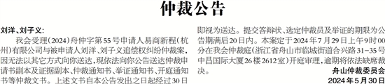 我会受理(2024)舟仲字第55号申请人易商新程(杭州)有限公司与被申请人刘洋、刘子义追偿权纠纷仲裁案,因无法以其它方式向你送达,现依法向你公告送达仲裁申请书副本及证据副本、仲裁通知书、举证通知书、开庭通知书等仲裁文书。上述文书自本公告发出之日起经过30日即视为送达。提交答辩状、选定仲裁员及举证的期限为公告期满后20日内。本案定于2024年7月29日上午9时00分在我会仲裁庭(浙江省舟山市临城街道合兴路31-35号中昌国际大厦26楼2612室)开庭审理,逾期将依法缺席裁决。 舟山仲裁委员会