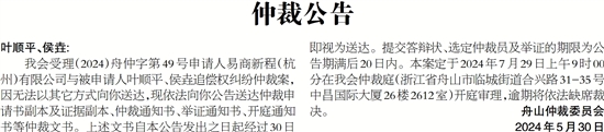 我会受理(2024)舟仲字第49号申请人易商新程(杭州)有限公司与被申请人叶顺平、侯垚追偿权纠纷仲裁案,因无法以其它方式向你送达,现依法向你公告送达仲裁申请书副本及证据副本、仲裁通知书、举证通知书、开庭通知书等仲裁文书。上述文书自本公告发出之日起经过30日即视为送达。提交答辩状、选定仲裁员及举证的期限为公告期满后20日内。本案定于2024年7月29日上午9时00分在我会仲裁庭(浙江省舟山市临城街道合兴路31-35号中昌国际大厦26楼2612室)开庭审理,逾期将依法缺席裁决。 舟山仲裁委员会