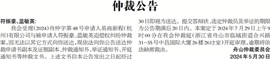 我会受理(2024)舟仲字第48号申请人易商新程(杭州)有限公司与被申请人符振豪、蓝敏英追偿权纠纷仲裁案,因无法以其它方式向你送达,现依法向你公告送达仲裁申请书副本及证据副本、仲裁通知书、举证通知书、开庭通知书等仲裁文书。上述文书自本公告发出之日起经过30日即视为送达。提交答辩状、选定仲裁员及举证的期限为公告期满后20日内。本案定于2024年7月29日上午9时00分在我会仲裁庭(浙江省舟山市临城街道合兴路31-35号中昌国际大厦26楼2612室)开庭审理,逾期将依法缺席裁决。 舟山仲裁委员会