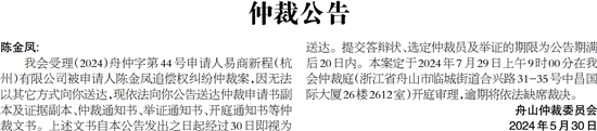 我会受理(2024)舟仲字第44号申请人易商新程(杭州)有限公司被申请人陈金凤追偿权纠纷仲裁案,因无法以其它方式向你送达,现依法向你公告送达仲裁申请书副本及证据副本、仲裁通知书、举证通知书、开庭通知书等仲裁文书。上述文书自本公告发出之日起经过30日即视为送达。提交答辩状、选定仲裁员及举证的期限为公告期满后20日内。本案定于2024年7月29日上午9时00分在我会仲裁庭(浙江省舟山市临城街道合兴路31-35号中昌国际大厦26楼2612室)开庭审理,逾期将依法缺席裁决。
