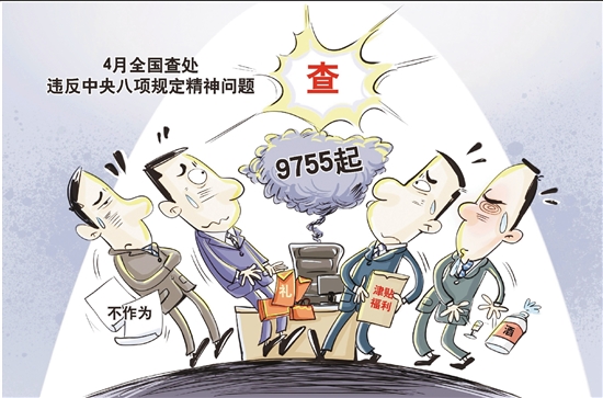 中央纪委国家监委网站5月27日公布全国查处违反中央八项规定精神问题情况月报数据。通报显示,今年4月,全国共查处违反中央八项规定精神问题9755起,批评教育和处理13656人(包括1名省部级干部、73名地厅级干部),给予党纪政务处分8916人。