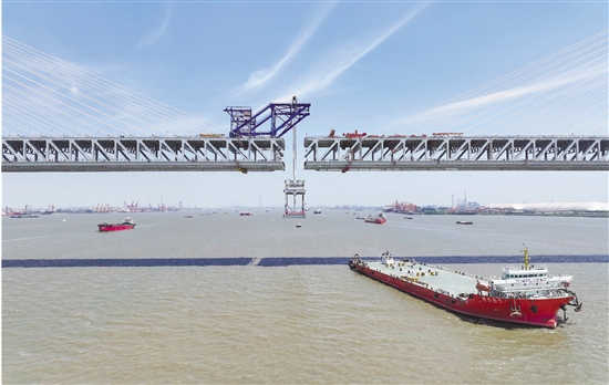 | 5月29日拍摄的常泰长江大桥主航道桥合龙段钢桁梁吊装现场(无人机照片)。 当日,常泰长江大桥主航道桥最后一节钢桁梁——合龙段钢桁梁顺利吊装到位,拉开主桥合龙的序幕,预计6月上旬完成合龙,实现全桥贯通。 常泰长江大桥连接江苏省的常州市与泰州市,是一座集高速公路、城际铁路、普通公路于一体的过江通道。 新华社 季春鹏 摄 |
