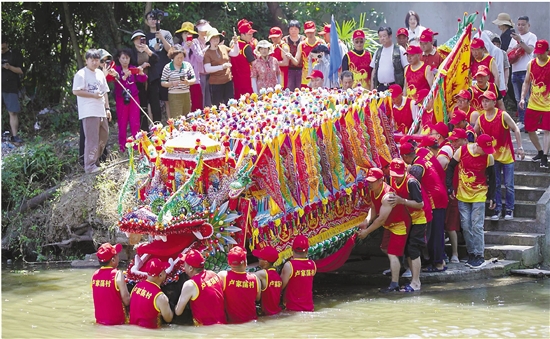 | 5月29日,长兴县洪桥镇古龙村卢家荡自然村举行了隆重的花龙船下水仪式。长兴花龙船是省级非物质文化遗产,不同于常见的窄长型龙舟,洪桥的花龙船有着更为宽胖的船身和更绚烂的造型,划动花龙船需12人,坐艄、桩刀、敲锣、打鼓各1人,其余8人分别坐在两边划船,船上插满360面旗帜,船身、船桨上均写满“风调雨顺”“国泰民安”“端阳吉庆”等吉祥语。 通讯员 邹黎 摄 |