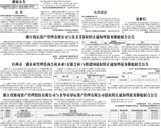 浙江省浙商资产管理股份有限公司与金华市泽辰资产管理有限公司债权转让通知暨债务催收联合公告