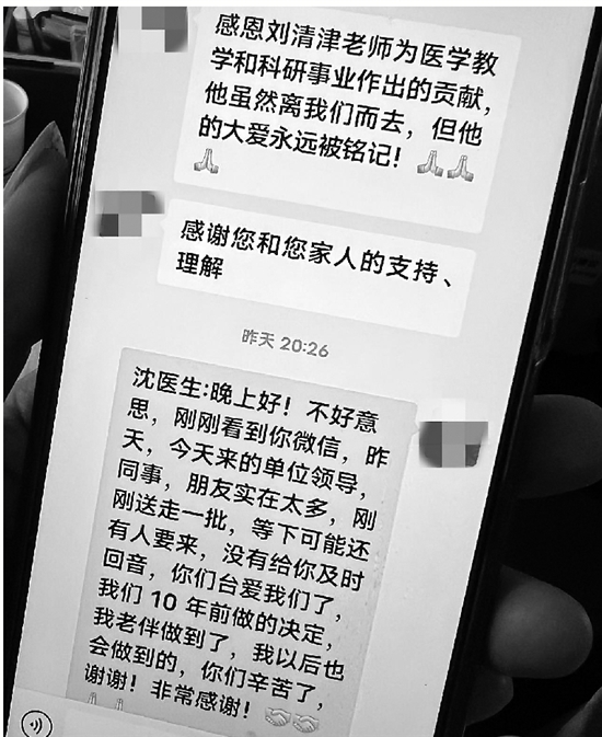 病情来得突然,也恶化得很快。捐赠遗体那天,程银仙一直在哭,“手一直是抖的。”即使这样,她仍然记得和医生强调,刘清津是要器官捐赠的,一定要遵从他的遗愿。“医生说,他的眼角膜很好,将会给一个等待捐赠的人带来希望。”程银仙打开手机,给记者看了看医生给她发来的感谢信息。