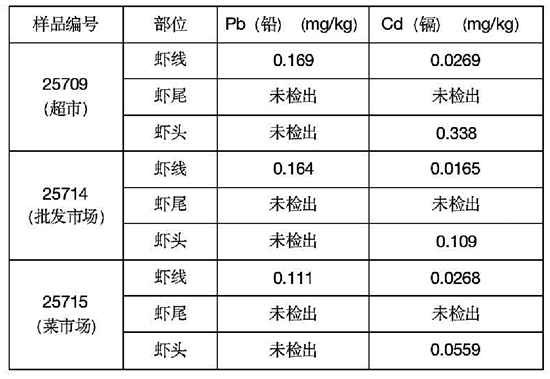 他们先将市场上随机购买的3批新鲜小龙虾用蒸馏水进行清洗,再将其解剖为虾头、虾线、虾肉三部分,并对其进行取样,检测其铅、镉、汞、呋喃唑酮代谢物和氯霉素的含量。根据食品安全国家标准,铅、镉限量为0.5毫克/千克。