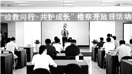 本报讯 近日,杭州市临安区检察院举办“检教同行·共护成长”检察开放日活动,上演论坛剧场《守护少年的你》。活动邀请区关工委、区妇联、区教育局、区公安分局、区人民法院、区市场监管局、区文旅局、区民政局等相关部门工作人员,以及特约检察员、人民监督员、学生家长代表共同演绎。