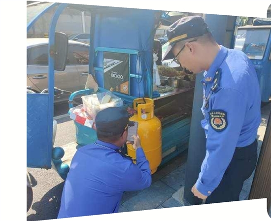 | 执法队员在“潮汐摊位”检查燃气安全 |