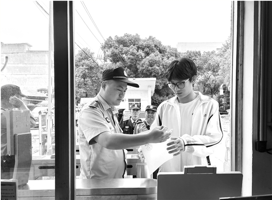 高考期间,台州市公安局椒江分局洪家派出所民警在高考点设立“考生临时身份证明办理点”,方便忘记携带身份证或身份证遗失的考生及时办理临时身份证明,助力考生顺利参加高考。图为一名遗失身份证的考生从民警手中接过临时身份证明,办理时间仅1分钟。