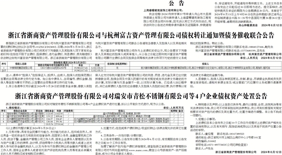 根据浙江省浙商资产管理股份有限公司与杭州富吉资产管理有限公司签署的《债权转让协议》(合同号:01ZXCZ2024002、日期:2024年5月30日),浙江省浙商资产管理股份有限公司已将其对下列借款人及其担保人项下享有的全部权利(包括但不限于主债权、担保债权、违约金债权、利息债权、损失赔偿权)依法转让给杭州富吉资产管理有限公司。浙江省浙商资产管理股份有限公司与杭州富吉资产管理有限公司联合公告通知各借款人及担保人以及其他相关各方。