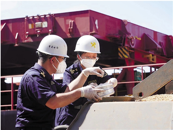 而要如何保证货物提离至目的地这段路上的安全?海关使用了进口粮食江海联运检疫监管措施,完善口岸与目的地海关联动配合机制,并通过二程船移动视频监控等技术手段强化后续监管,有效地防范了撒漏以及疫情扩散风险。