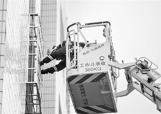 点火约15分钟后,消防员开展登高车破拆防盗窗模拟真实火场救人场景,测试不同形式防盗窗的逃生和救援情况——当一层楼梯间电动自行车起火时,同时进行“拆窗破网”逃生模拟:三楼设置普通防盗窗,消防员乘坐云梯车使用破拆工具进行破拆;四楼设置可开启外窗防盗窗,开启1米×1米逃生窗口,人员从内部进行逃生,消防员用云梯车接应;五楼不设置防盗窗,消防员用云梯车进行救援。