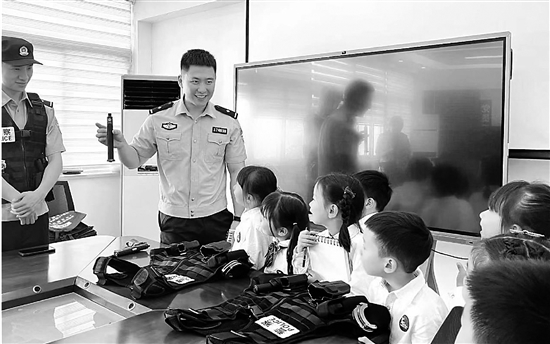 近日,天台县公安局城西派出所开展了“萌娃进警营”主题活动。始丰中心幼儿园的孩子们在老师的带领下走进派出所,零距离体验警营生活。民警向小朋友们讲解防骗、防拐、防溺水等安全知识,示范单警装备、枪械等各类警用装备功能用途。活动进一步提高了小朋友们的安全防范意识。