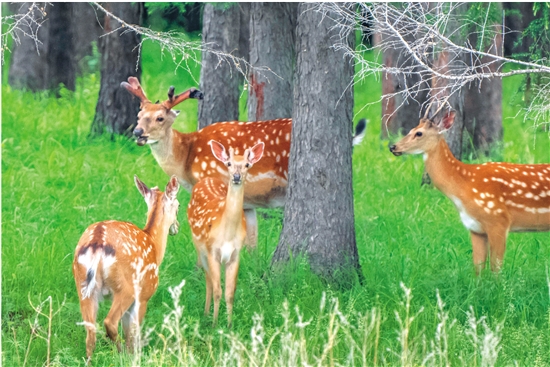 仲夏时节,位于齐齐哈尔市拜泉县的黑龙江仙洞山梅花鹿国家级自然保护区草木葱茏,保护区内的梅花鹿种群怡然栖居,生机勃勃。