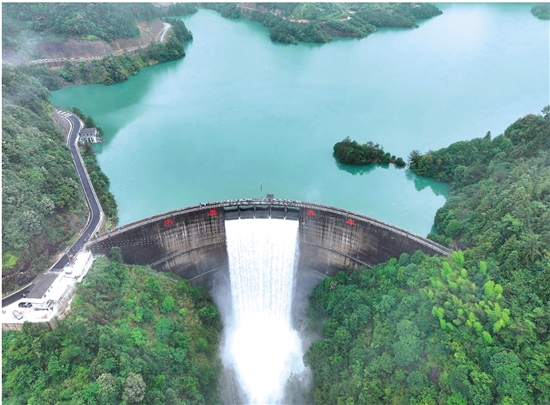 6月17日,武义县内庵、清溪口等水库溢洪,滚滚水流从溢洪道倾泻而下。入梅以来,武义县迎来多轮降雨,全县蓄水量最大的源口、清溪口、内庵、石硖等水库都库盈水满。根据雨势监测和库容情况,这些水库已多轮开闸泄洪,以起到拦洪削峰作用,确保大坝运行安全和下游人民生命财产安全。