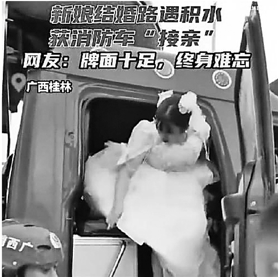 6月19日,广西桂林,多路段积水。一位美丽的新娘赶往婚礼现场,途经涉水路段,家人用小船护送新娘出嫁,恰巧碰到要前往目的地附近救援的消防员。在了解情况后,消防员将新娘邀请上车,一路护送。