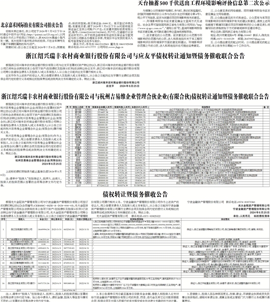 根据浙江绍兴瑞丰农村商业银行股份有限公司与杭州吉易维企业管理合伙企业(有限合伙)签署的《资产转让协议》,浙江绍兴瑞丰农村商业银行股份有限公司已将所合法拥有的本公告项下资产(包括债权及担保从权利)依法转让给杭州吉易维企业管理合伙企业(有限合伙),浙江绍兴瑞丰农村商业银行股份有限公司特公告通知各债务人及担保人(或义务承担人),从公告之日起向杭州吉易维企业管理合伙企业(有限合伙)履行相关义务。