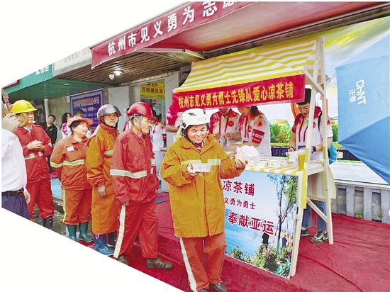 当日早上7点多,记者在凉茶摊忙碌的队员中看到了一个熟悉的面孔——因跳水救人而被评为“中国好人”的外卖小哥彭清林,“吴大哥带我加入了杭州市见义勇为先锋队,长期为大家做做事”。