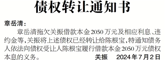 章岳清拖欠关振借款本金2050万元及相应利息、违约金等,关振将上述债权已经转让给陈根宝,特通知债务人依法向债权受让人陈根宝履行借款本金2050万元债权本息的义务。 关振 2024年7月2日