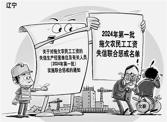 | 记者近日从辽宁省人力资源和社会保障厅获悉,为了维护劳动者合法权益,完善失信约束机制,加强信用监管,辽宁省下发《关于对拖欠农民工工资的失信生产经营单位及有关人员(2024年第一批)实施联合惩戒的通知》,并公布了2024年第一批拖欠农民工工资失信联合惩戒名单。 新华社 王鹏 作 |