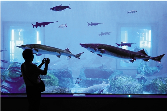 | 7月1日,游客在长江鄱阳湖水生生物保护中心参观拍摄。 长江鄱阳湖水生生物保护中心位于江西省九江市湖口县,于2022年12月建成并投入运行,中心内设有淡水鱼类展示馆,展示鲟鱼、胭脂鱼、金吉罗、射水鱼等百余种鱼类,以及大鲵、龟、旱獭等动物。 长江与鄱阳湖交汇处的湖口县拥有丰富的水生生物资源。当地通过建设长江鄱阳湖水生生物保护中心等项目,为科教、旅游等赋能,打造文旅地标。据介绍,2023年长江鄱阳湖水生生物保护中心接待各类研学游、亲子游等35万人次。 新华社 杜潇逸 摄 |
