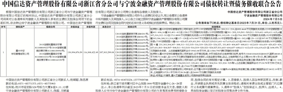 中国信达资产管理股份有限公司浙江省分公司与宁波金融资产管理股份有限公司债权转让暨债务催收联合公告