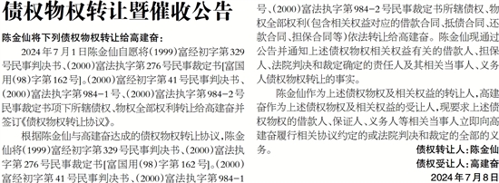 根据陈金仙与高建奋达成的债权物权转让协议,陈金仙将(1999)富经初字第329号民事判决书、(2000)富法执字第276号民事裁定书[富国用(98)字第162号]。(2000) 富经初字第41号民事判决书、(2000)富法执字第984-1号、(2000)富法执字第984-2号民事裁定书所辖债权、物权全部权利(包含相关权益对应的借款合同、抵债合同、还款合同、担保合同等)依法转让给高建奋。陈金仙现通过公告并通知上述债权物权相关权益有关的借款人、担保人、法院判决和裁定确定的责任人及其相关当事人、义务人债权物权转让的事实。
