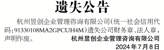 杭州昱创企业管理咨询有限公司(统一社会信用代码:91330108MA2GPCUH4M)遗失公司财务章、法人章,声明作废。 杭州昱创企业管理咨询有限公司