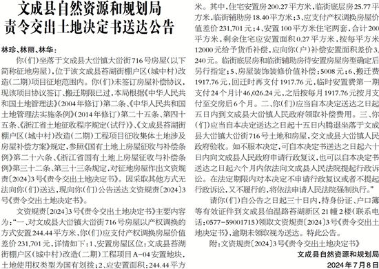 你(们)坐落于文成县大峃镇大峃街716号房屋(以下简称征地房屋),位于该文成县苔湖街棚户区(城中村)改造(二期)项目征地范围内。你(们)未签订房屋补偿协议,现该项目协议签订、搬迁期限已过,本局根据《中华人民共和国土地管理法》(2004年修订)第二条、《中华人民共和国土地管理法实施条例》(2014年修订)第二十五条、第四十五条、《浙江省土地征收程序规定(试行)》、《文成县苔湖街棚户区(城中村)改造(二期)工程项目征收集体土地涉及房屋补偿方案》规定,参照《国有土地上房屋征收与补偿条例》第二十六条、《浙江省国有土地上房屋征收与补偿条例》第三十二条、第三十三条规定,对征地房屋作出文资规责〔2024〕3号《责令交出土地决定书》。因采取其他方式无法向你(们)送达,现向你(们)公告送达文资规责〔2024〕3号《责令交出土地决定书》。