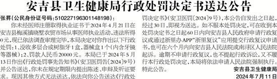 你未经医师注册取得执业证书于2024年4月21日在安吉县梅溪镇晓墅农贸市场从事医师执业活动,违法所得0元,现已依法调查审理完毕,本局决定对你作出以下行政处罚:1、没收多层合成树脂牙1盒,器械盒1个(内含牙镜等器械);2、罚款人民币20000元。本局已于2024年5月13日作出《行政处罚事先告知书》(安卫医罚告〔2024〕9号)并公告送达,你未在规定期限内提出陈述、申辩及听证要求。现因其他方式无法送达,依法向你公告送达《行政处罚决定书》(安卫医罚〔2024〕9号),本公告自发出之日起,经过30日,即视为送达。如不服本处罚决定,可在收到本处罚决定书之日起60日内向安吉县人民政府申请行政复议或通过浙里办APP“浙里复议”应用提交行政复议申请书,也可在六个月内向安吉县人民法院或南浔区人民法院起诉。逾期不申请行政复议,也不提起行政诉讼,又不履行本行政处罚决定,本局将依法申请人民法院强制执行。特此公告。 安吉县卫生健康局