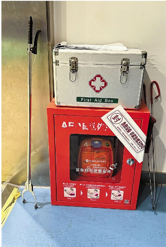 在游泳馆门口的一个显眼位置,记者看到一个写着AED(自动体外除颤仪)的红色铁盒,上面写着使用步骤,另外检查记录的台账也放在旁边。中心工作人员告诉记者,AED是心脏骤停患者的“救命神器”,当场所突然出现有人心脏骤停时,迅速使用仪器可大大提高生存率。