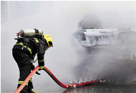新能源汽车越来越受大家青睐,但因其电池的特殊性,若发生火灾,扑救一直存在很大难度。7月11日上午,衢州市柯城区消防救援局利用水枪、“灭火管”、灭火毯“三件套”,进行了一次新能源汽车火灾灭火测试实验。