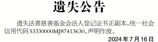 遗失法喜慈善基金会法人登记证书正副本,统一社会信用代码53330000MJ87413630,声明作废。