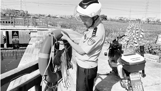 连日来,台州市公安局椒江分局前所派出所结合夏季治安打击整治行动,组织警力开展常态化巡河,及时消除安全隐患,有效防止溺水事故发生。图为民警在河道边检查救生圈是否完好。